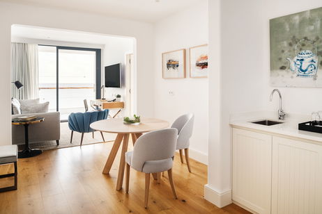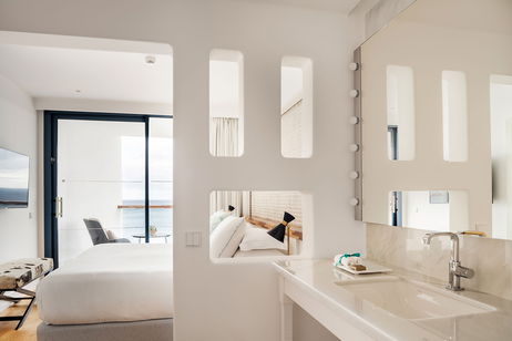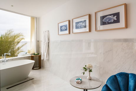 Perfecto equilibrio entre tecnología de vanguardia y lujo y 16m² de una espaciosa terraza iluminada por el sol del Atlántico, con vistas a piscina y mar. Disponen de dormitorio con 2 camas individuales de 110 cm., sala de estar independiente y cuarto de baño completo con bañera exenta, ducha independiente con efecto lluvia, secador, espejo iluminado de aumento y set de amenities Per Purr.