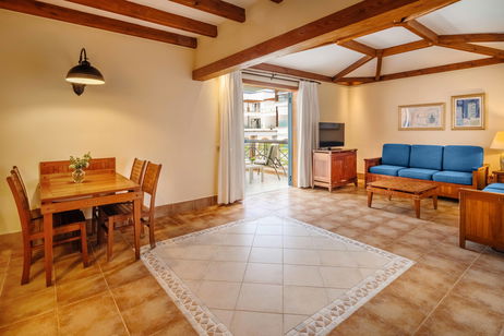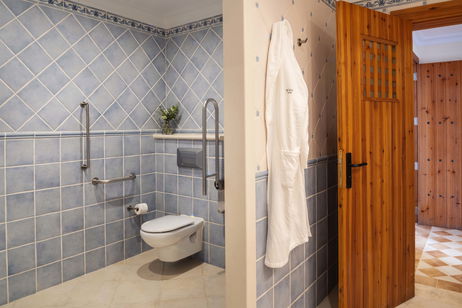 Suites adaptadas para permitir en todo su espacio la movilidad de los huéspedes que utilizan silla de ruedas y con deficiencias auditivas. Situadas en el edificio principal cuentan con 65m² y terraza de 10m² con vistas a jardines o piscina. Decoradas y amuebladas en estilo Colonial Canario, cuentan con un dormitorio con cama de matrimonio o bien camas separadas, un salón independiente, un cuarto de baño completo con ducha y bañera separadas y todas las demás comodidades que asegurarán una placentera estancia. Estas habitaciones cuentan con las siguientes instalaciones adaptadas para asegurar una estancia confortable a nuestros huéspedes con movilidad reducida y deficiencias auditivas:
